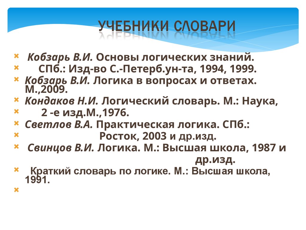 Кобзарь В.И. Основы логических знаний.СПб.: Изд-во С.-Петерб.ун-та, 1994, 1999.