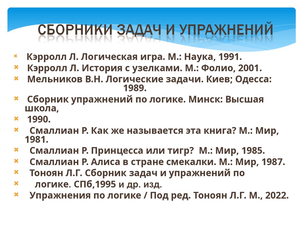 Кэрролл Л. Логическая игра. М.: Наука, 1991.Кэрролл Л. История с узелками. М.: Фолио, 2001.