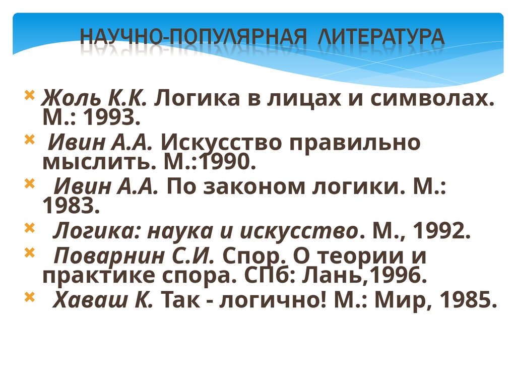 Жоль К.К. Логика в лицах и символах.М.: 1993.