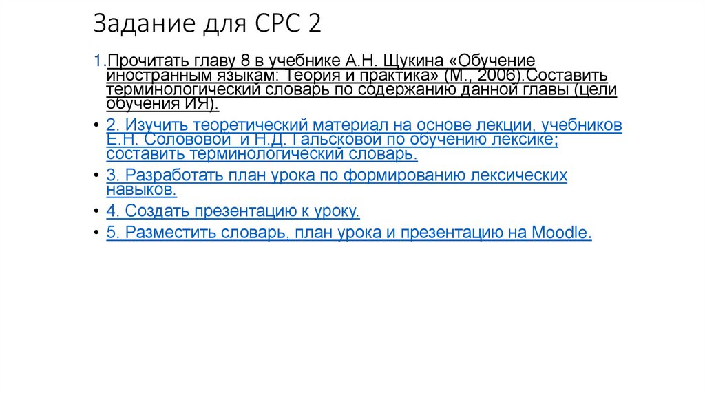 1.Прочитать главу 8 в учебнике А.Н. Щукина «Обучениеиностранным языкам: Теория и практика» (М., 2006).Составить