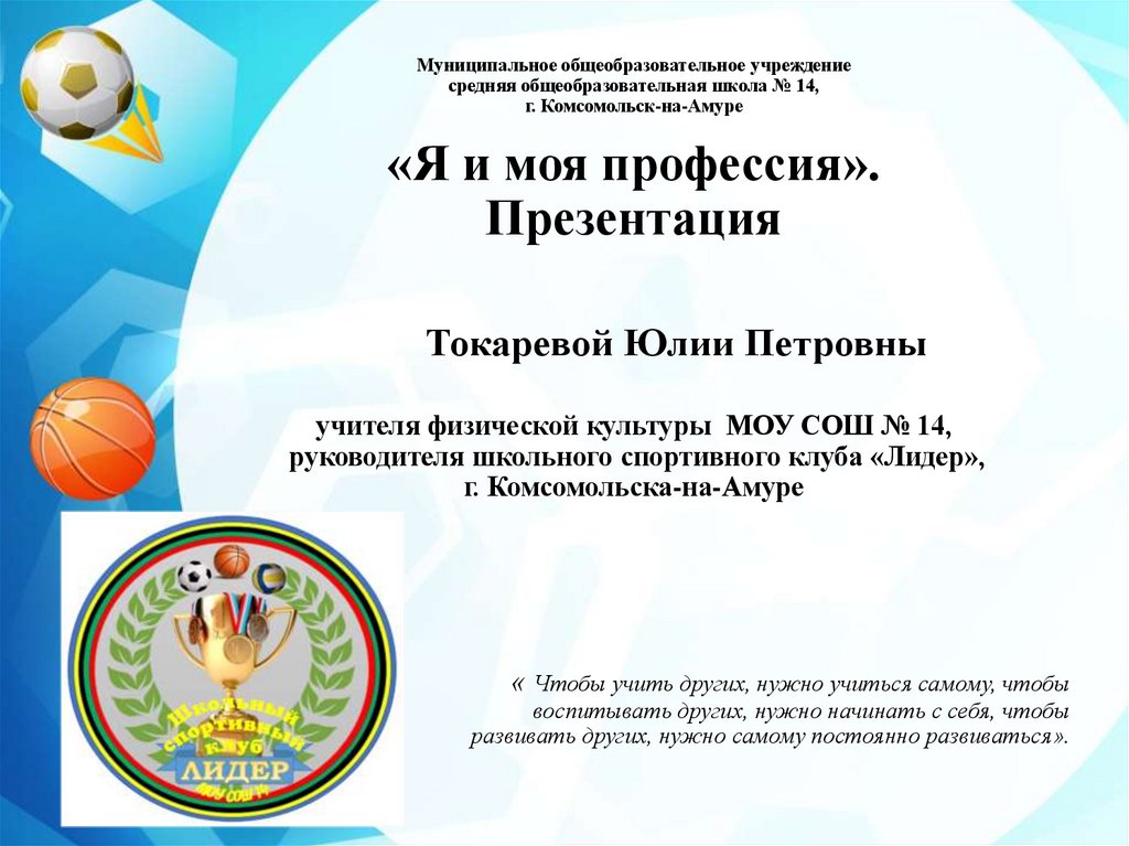 Номинация № 5 Презентация Токарева Ю.П. ШСК Лидер МОУ СОШ № 14 Комсомольск-ан-Амуре