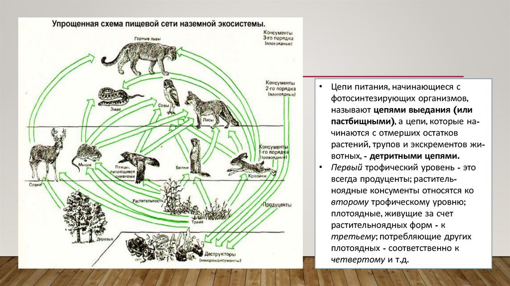 • Каждый следующий уровень теряет около 90% энергии (она уходит на дыхание,