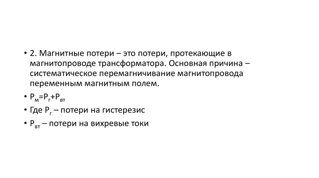 • 2. Магнитные потери – это потери, протекающие вмагнитопроводе трансформатора. Основная причина –