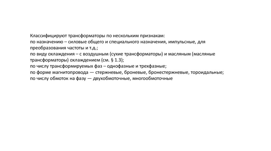 Классифицируют трансформаторы по нескольким признакам:по назначению – силовые общего и специального назначения, импульсные, для