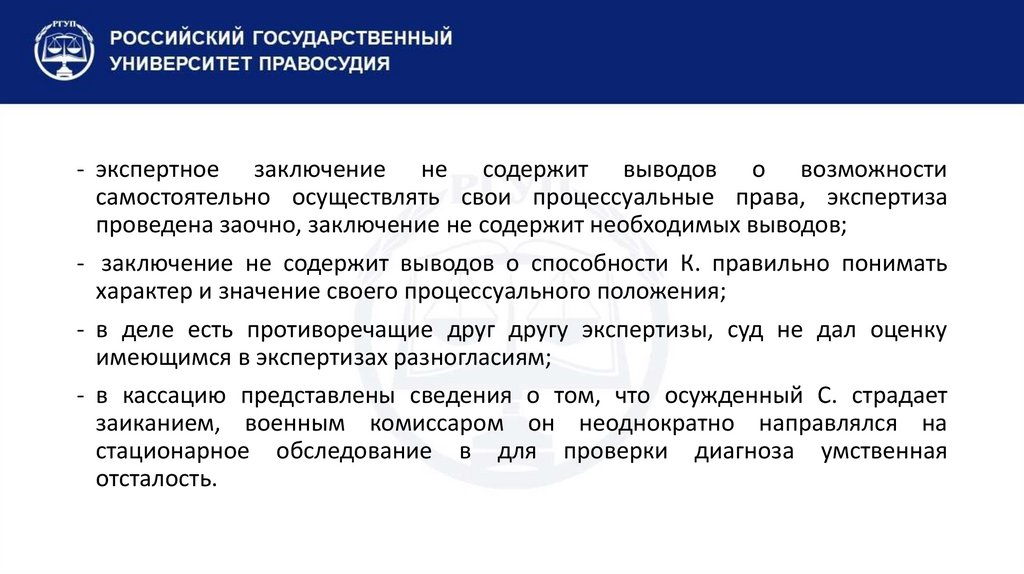 - экспертное заключение не содержит выводов о возможностисамостоятельно осуществлять свои процессуальные права, экспертиза