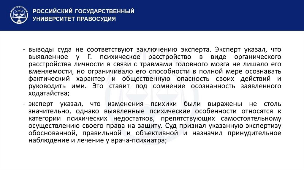 - выводы суда не соответствуют заключению эксперта. Эксперт указал, чтовыявленное у Г. психическое расстройство в виде органического