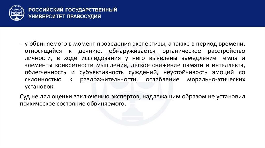 - у обвиняемого в момент проведения экспертизы, а также в период времени,относящийся к деянию, обнаруживается органическое расстройство