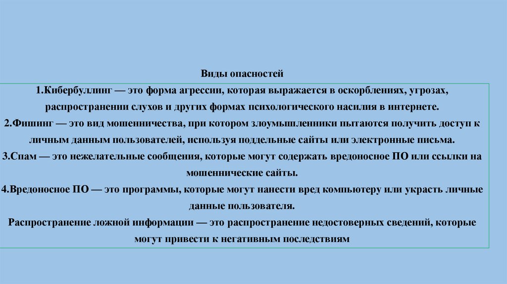 Виды опасностей1.Кибербуллинг — это форма агрессии, которая выражается в оскорблениях, угрозах,