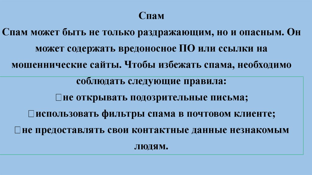3.Спам — это нежелательные сообщения, которые могут содержать вредоносное ПО или ссылки на