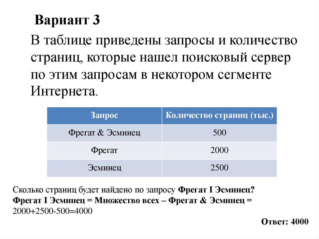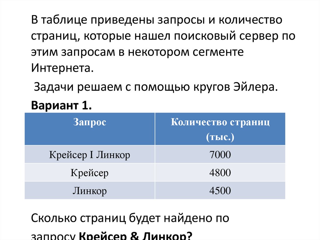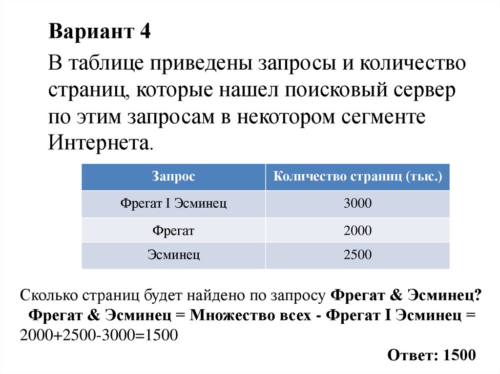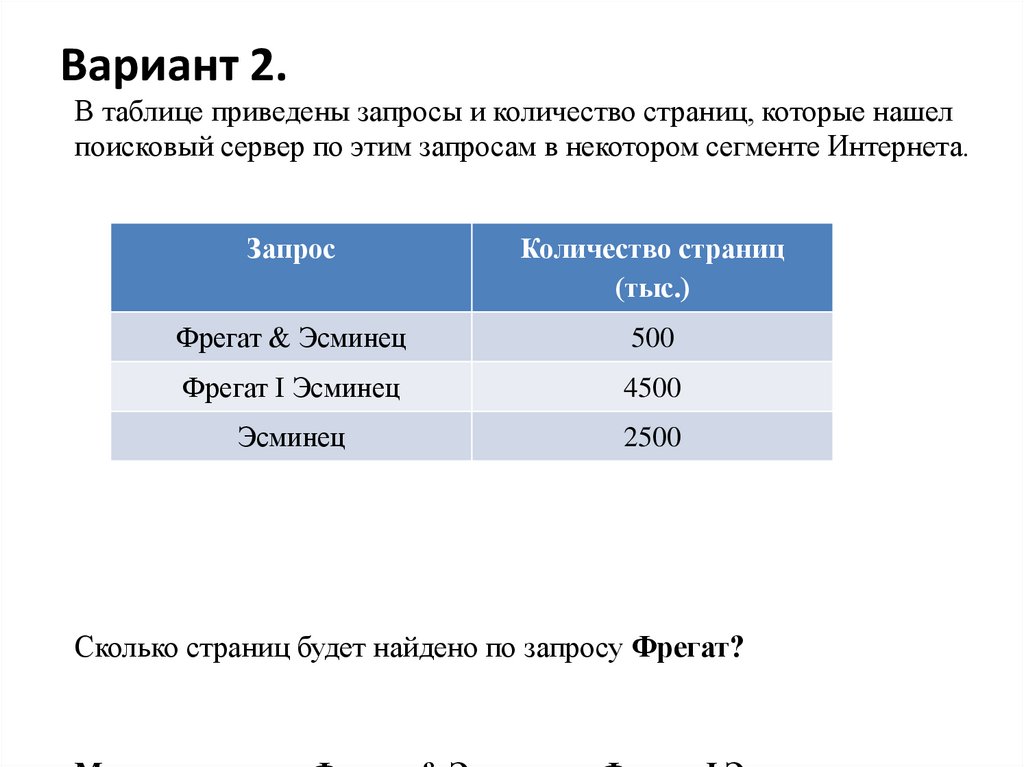 Вариант 2.В таблице приведены запросы и количество страниц, которые нашел