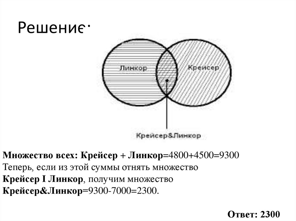 Решение:Множество всех: Крейсер + Линкор=4800+4500=9300