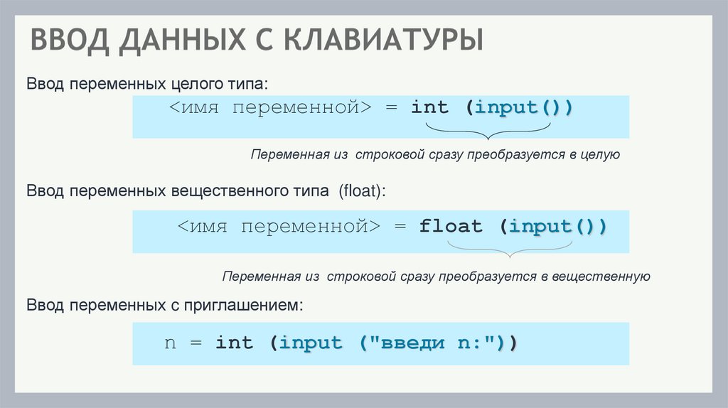 Ввод переменных целого типа:<имя переменной> = int (input())