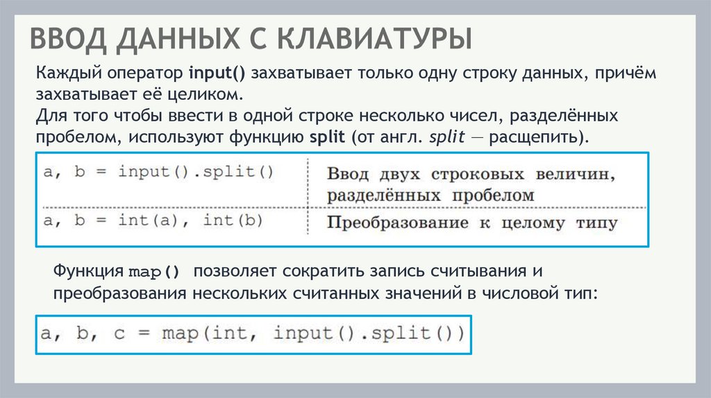 Каждый оператор input() захватывает только одну строку данных, причёмзахватывает её целиком.