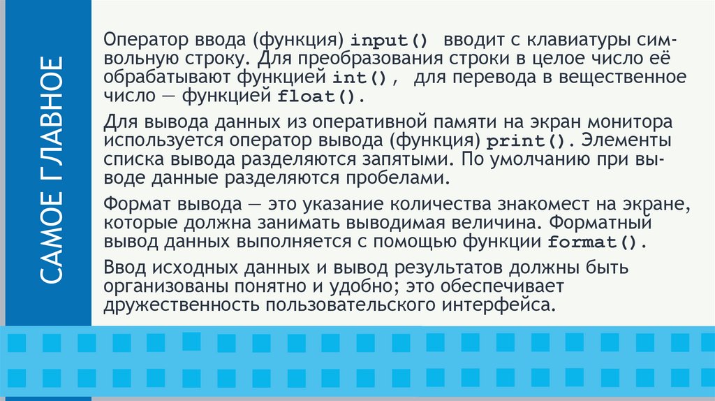 САМОЕ ГЛАВНОЕОператор ввода (функция) input() вводит с клавиатуры символьную строку. Для преобразования строки в целое число её