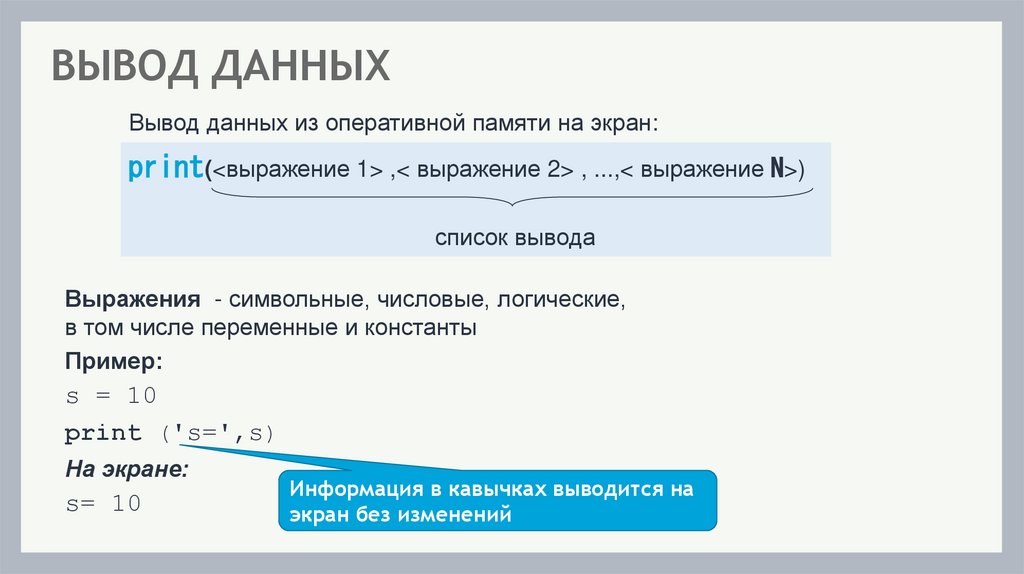 print(<выражение 1> ,< выражение 2> , ...,< выражение N>)