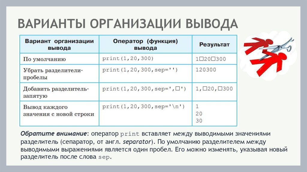 ВАРИАНТЫ ОРГАНИЗАЦИИ ВЫВОДАОбратите внимание: оператор print вставляет между выводимыми значениями