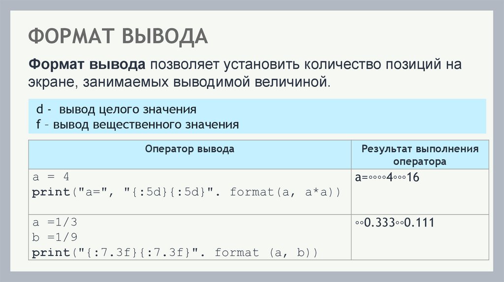 ФОРМАТ ВЫВОДАФормат вывода позволяет установить количество позиций на