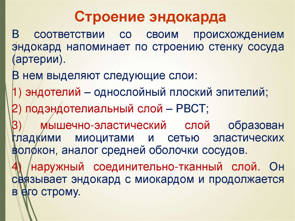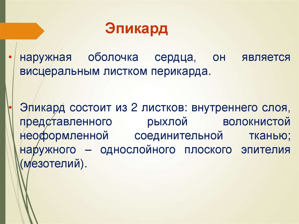 • Эпикард состоит из 2 листков: внутреннего слоя,