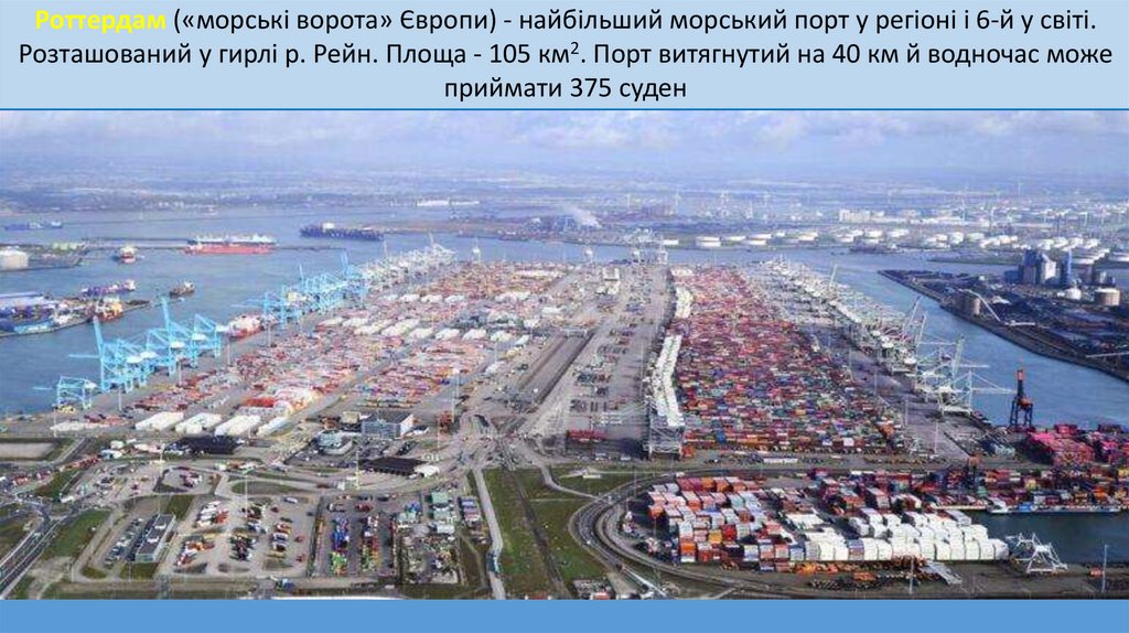 Роттердам («морські ворота» Європи) - найбільший морський порт у регіоні і 6-й у світі.Розташований у гирлі р. Рейн. Площа - 105 км2. Порт витягнутий на 40 км й водночас може