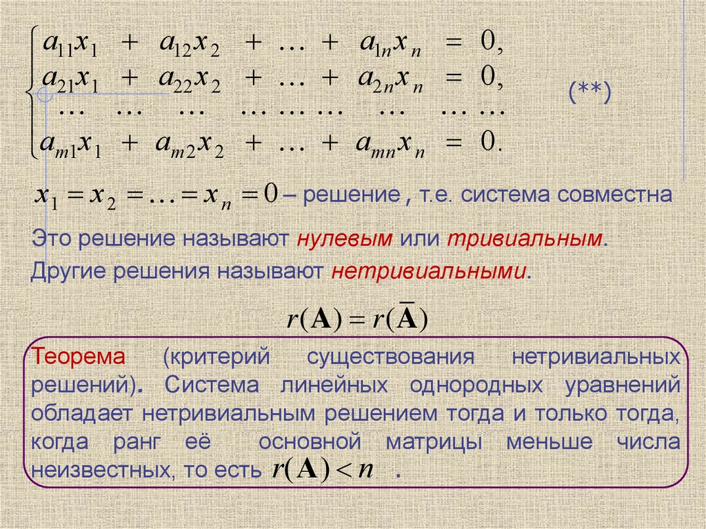 система имеет нетривиальные решения, то найдутся n – r