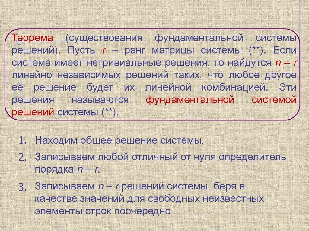 Теорема (существования фундаментальной системырешений). Пусть r – ранг матрицы системы (**). Если