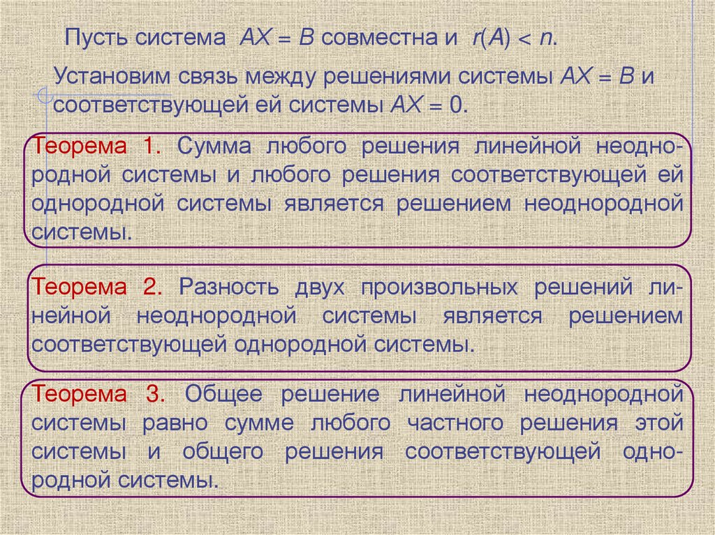 Теорема 1. Сумма любого решения линейной неоднородной системы и любого решения соответствующей ей
