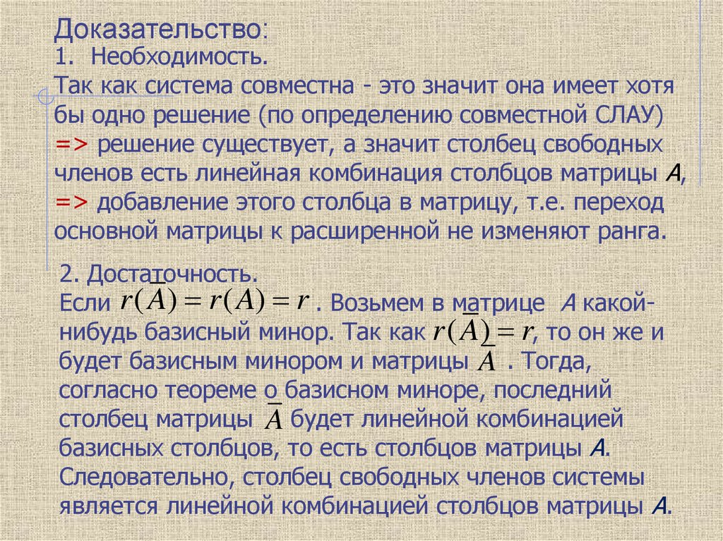 Если r ( A) r ( A) r . Возьмем в матрице А какойнибудь базисный минор. Так как r ( A) r, то он же и