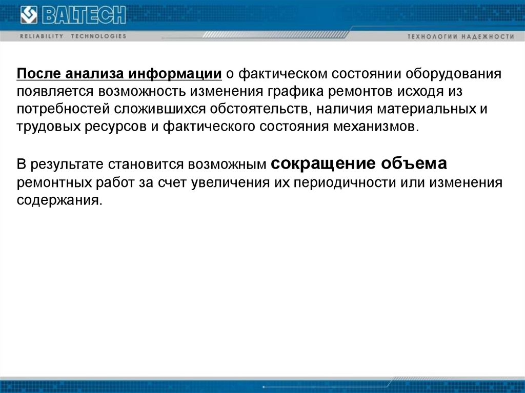После анализа информации о фактическом состоянии оборудованияпоявляется возможность изменения графика ремонтов исходя из
