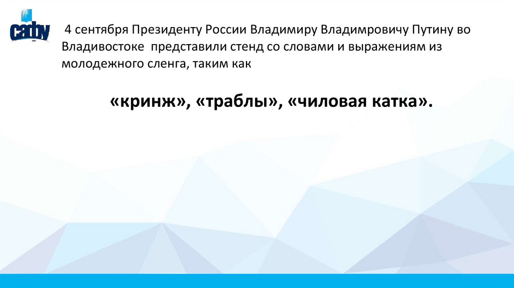 4 сентября Президенту России Владимиру Владимровичу Путину воВладивостоке представили стенд со словами и выражениям из