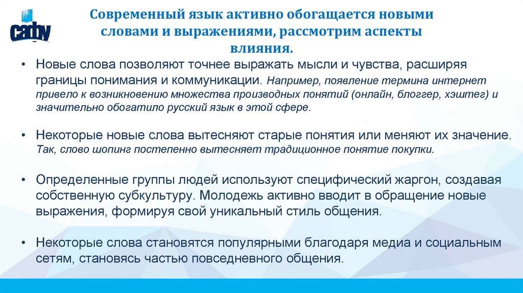 Современный язык активно обогащается новымисловами и выражениями, рассмотрим аспекты