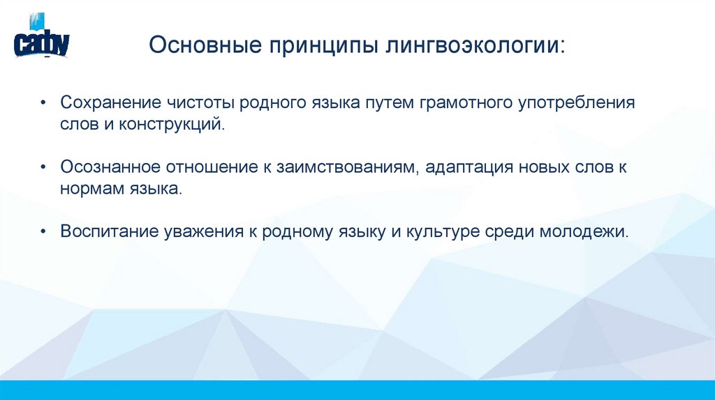 Основные принципы лингвоэкологии:• Сохранение чистоты родного языка путем грамотного употребления