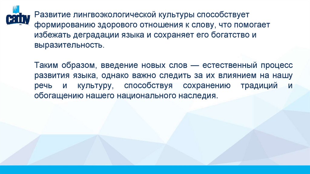 Развитие лингвоэкологической культуры способствуетформированию здорового отношения к слову, что помогает