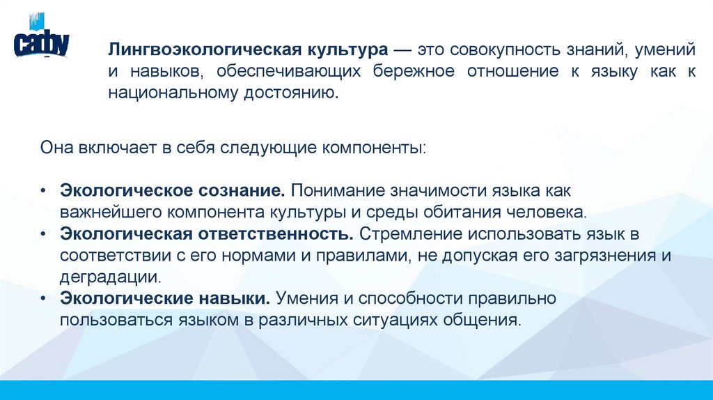 Лингвоэкологическая культура — это совокупность знаний, уменийи навыков, обеспечивающих бережное отношение к языку как к