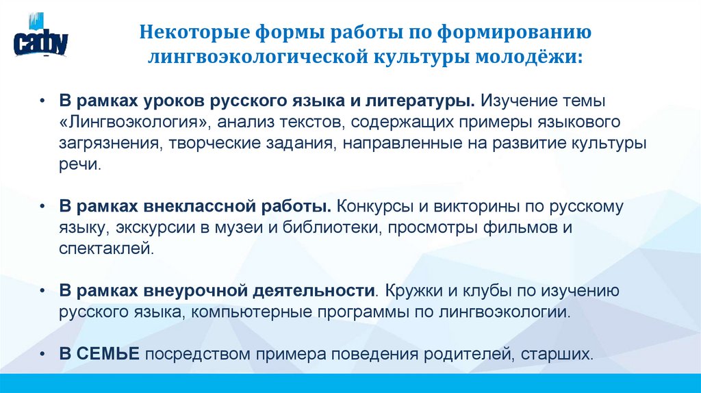 Некоторые формы работы по формированиюлингвоэкологической культуры молодёжи: