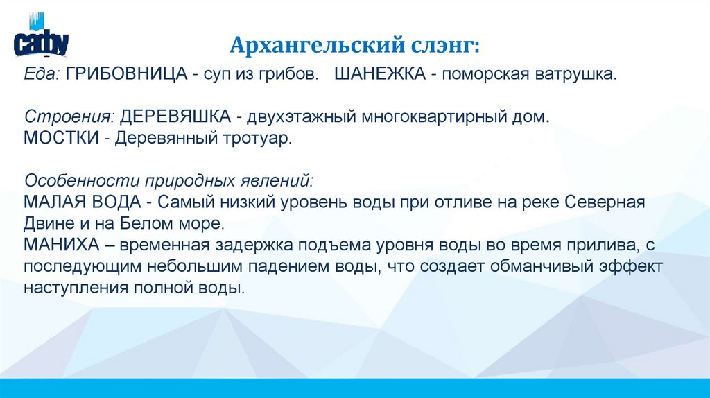 Архангельский слэнг:Еда: ГРИБОВНИЦА - суп из грибов. ШАНЕЖКА - поморская ватрушка.