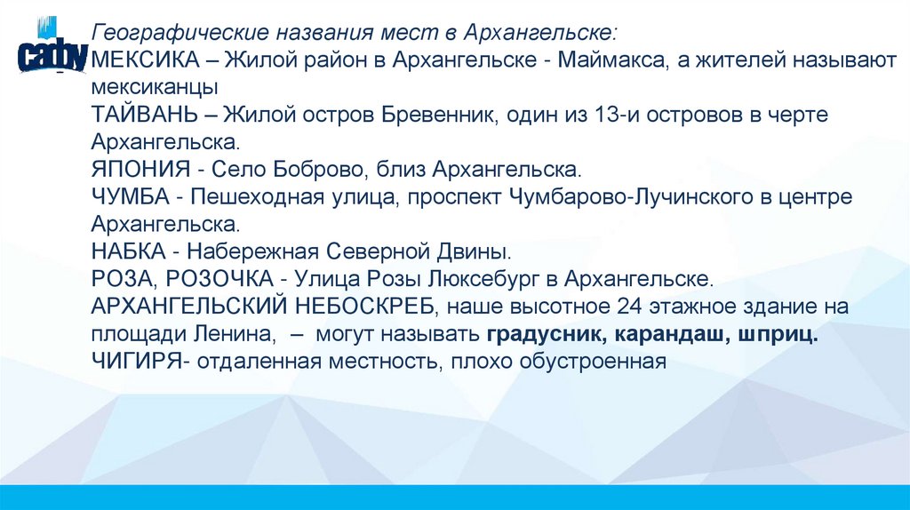 Географические названия мест в Архангельске:МЕКСИКА – Жилой район в Архангельске - Маймакса, а жителей называют