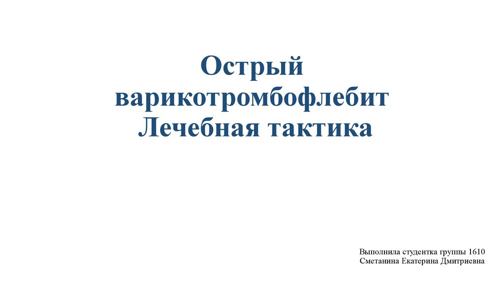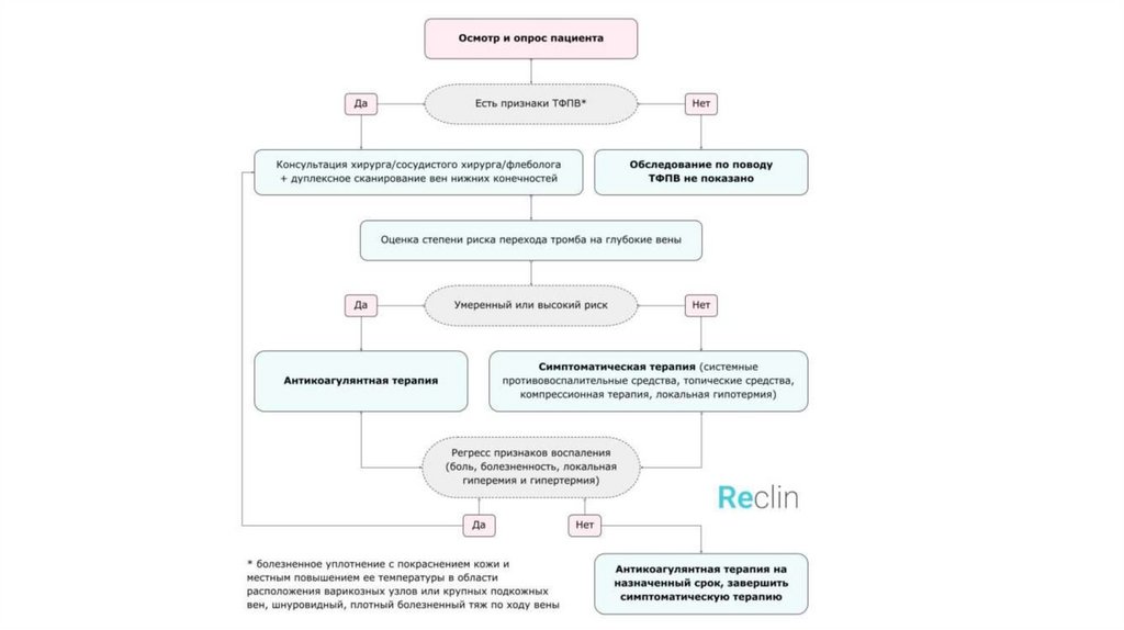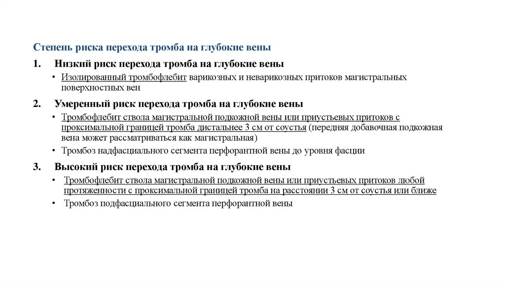 Тактика лечения в зависимости от степени риска и стадии ТФПВНизкий риск перехода тромба на глубокие вены