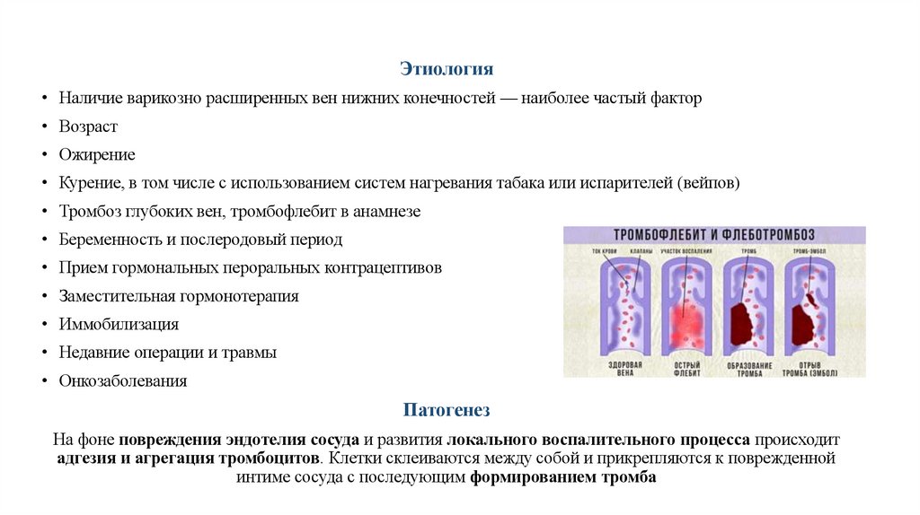 Этиология• Наличие варикозно расширенных вен нижних конечностей — наиболее частый фактор