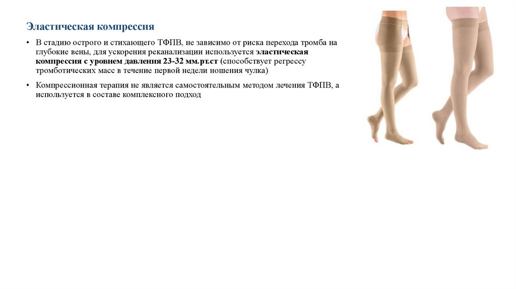 Эластическая компрессия• В стадию острого и стихающего ТФПВ, не зависимо от риска перехода тромба на