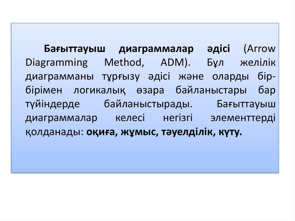 Бағыттауыш диаграммалар әдісі (ArrowDiagramming Method, ADM). Бұл желілік
