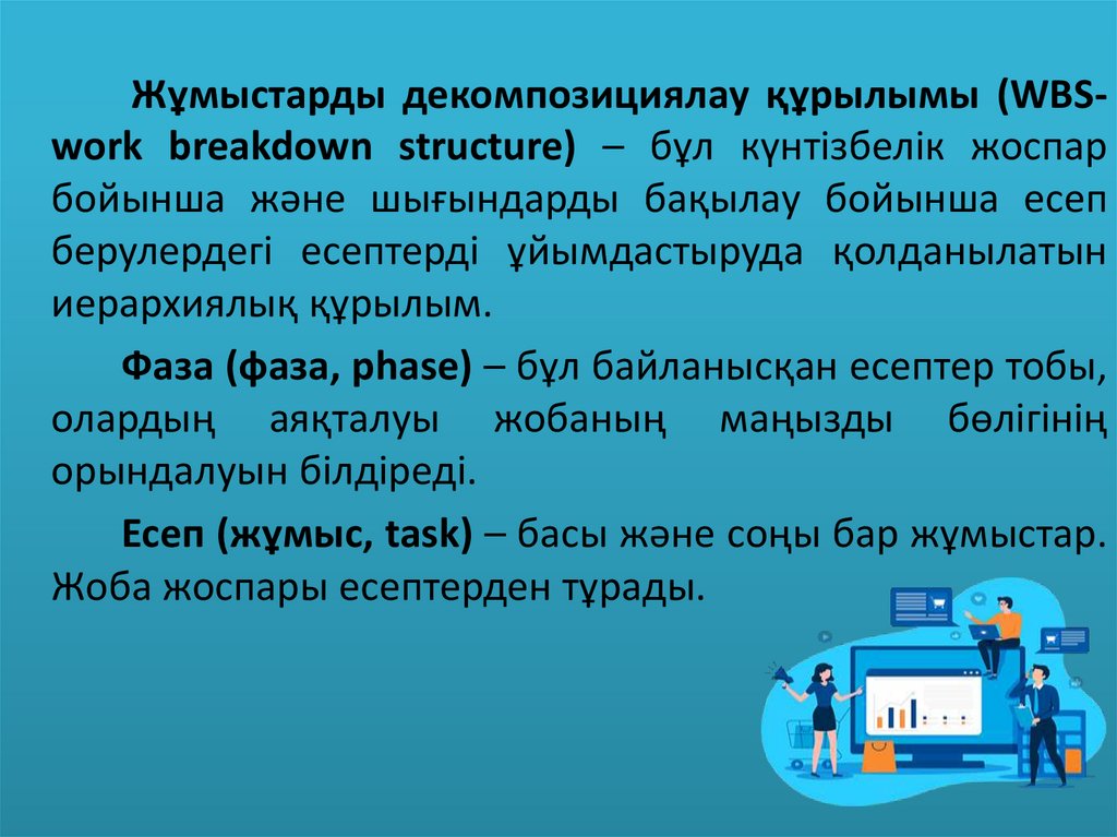 Жұмыстарды декомпозициялау құрылымы (WBSwork breakdown structure) – бұл күнтізбелік жоспарбойынша жəне шығындарды бақылау бойынша есеп