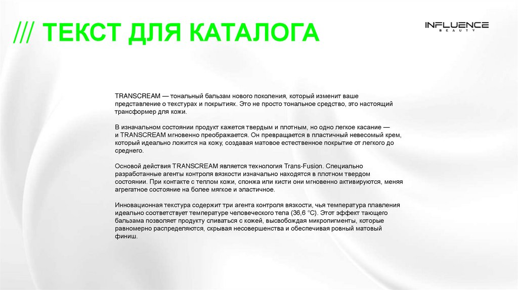 /// ТЕКСТ ДЛЯ КАТАЛОГАTRANSCREAM — тональный бальзам нового поколения, который изменит ваше