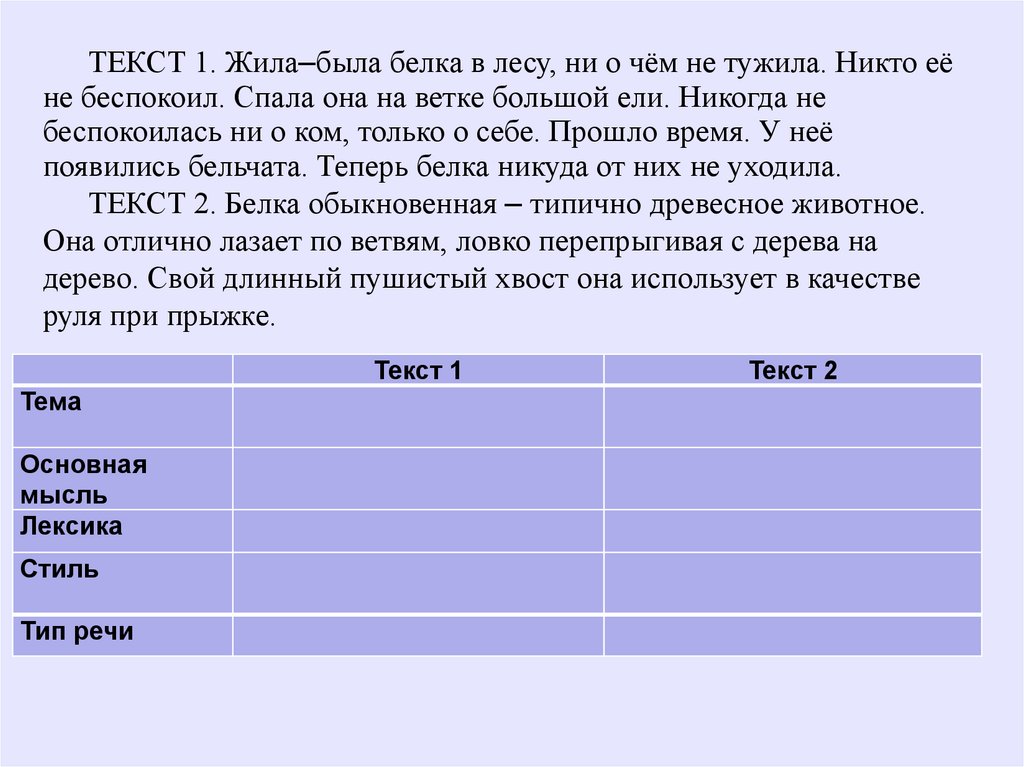 ТЕКСТ 1. Жила–была белка в лесу, ни о чём не тужила. Никто еёне беспокоил. Спала она на ветке большой ели. Никогда не