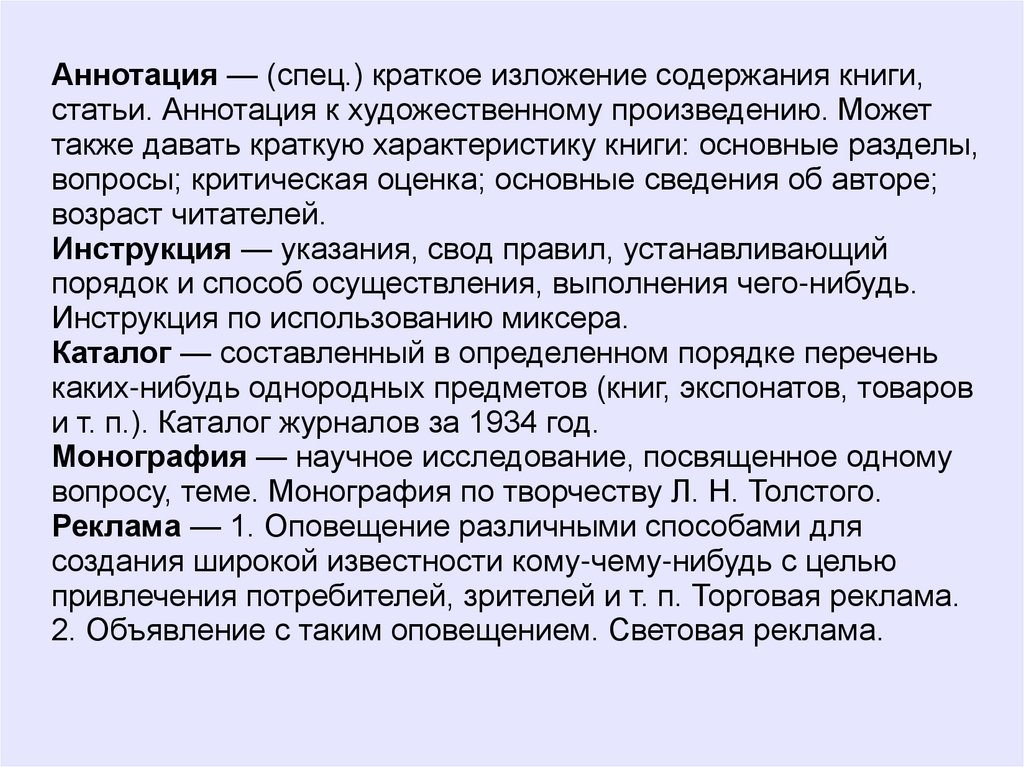 Аннотация — (спец.) краткое изложение содержания книги,статьи. Аннотация к художественному произведению. Может