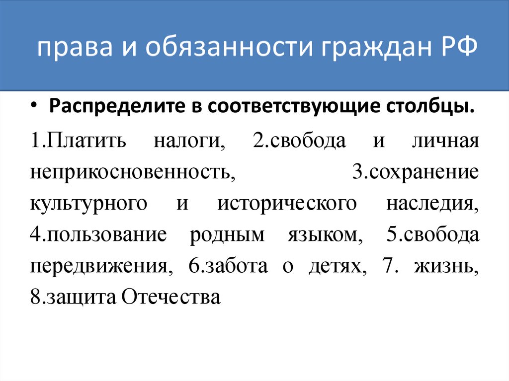 • Распределите в соответствующие столбцы.1.Платить налоги, 2.свобода и личная