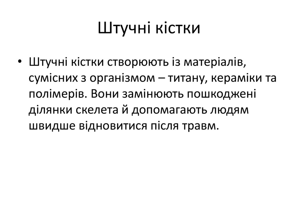 Штучні кістки• Штучні кістки створюють із матеріалів,