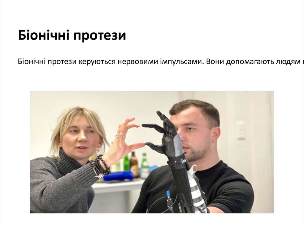 Біонічні протезиБіонічні протези керуються нервовими імпульсами. Вони допомагають людям в