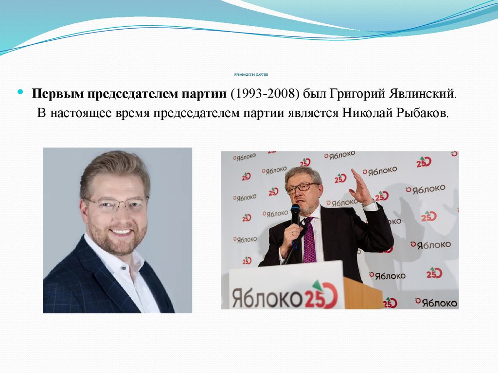 РУКОВОДСТВО ПАРТИИПервым председателем партии (1993-2008) был Григорий Явлинский.