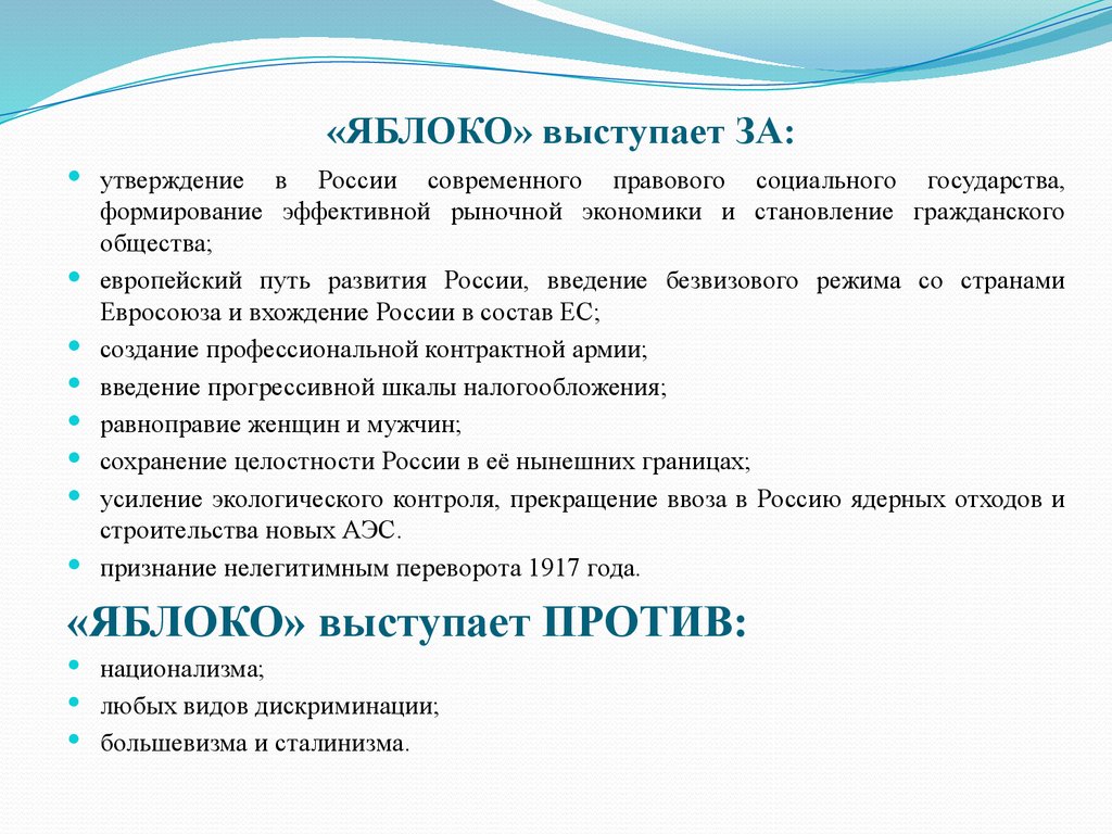 «ЯБЛОКО» выступает ЗА:утверждение в России современного правового социального государства,