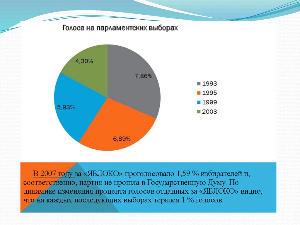 В 2007 году за «ЯБЛОКО» проголосовало 1,59 % избирателей и,соответственно, партия не прошла в Государственную Думу. По
